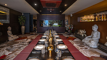 The most traditional Thai dining experience. With views of our tropical fish tank and gilded gold Buddhas, this exclusive area is sure to elevate your senses and add a touch of class to your reservation.