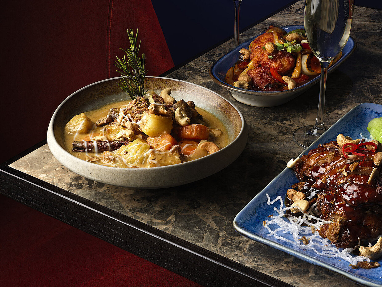 Slow-cooked lamb, carrot, potatoes, crispy shallots and toasted cashew nuts.