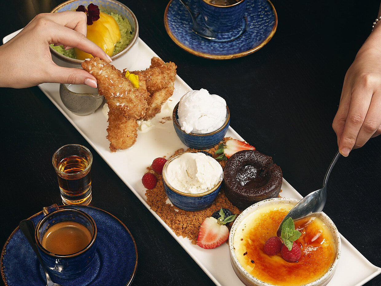 Fragrant Mango Sticky Rice, silky Coconut Crème Brûlée, crispy Banana Fritters, and a rich, molten Chocolate Fondant.